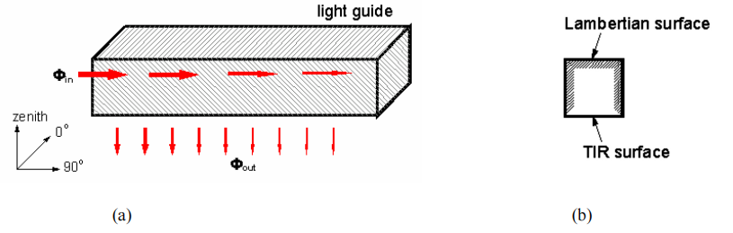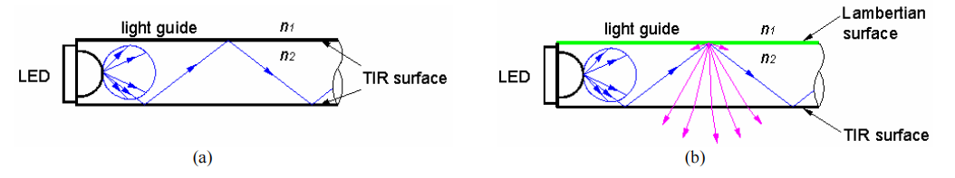 Figure 2: (a) a perfectly polished light guide; (b) a light guide with a lambertian scattering surface.