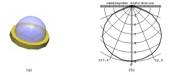 provide flux as high as 18 lumens. The light source model was created in LightTools. Figure 3 shows the LED source model and its lambertian candlepower distribution, which match the specification from the manufacturer.