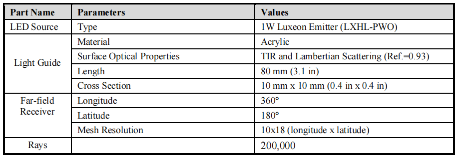 Table 1: The light guide physical model parameters in LightTools.