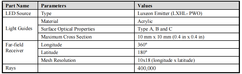 Table 2: The physical model parameters of the light guides in LightTools.