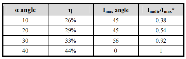 *Imax: maximum luminous intensity along the light guide (0o); Inadir: luminous intensity at the nadir angle.