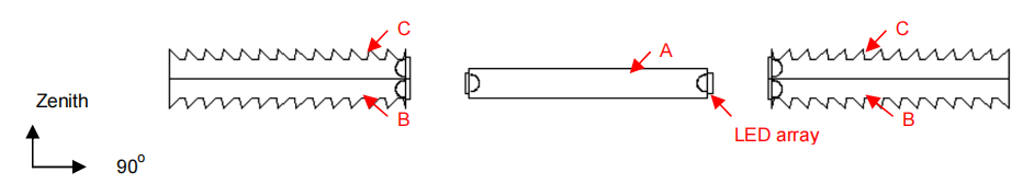In this study, a symmetrical distribution along the fixture (0 degree direction) was desired. Therefore, a batwing distribution could be achieved by combining two identical light guides. Both had a maximum intensity at the 45 degree zenith/nadir angle, as illustrated by Figure 7.