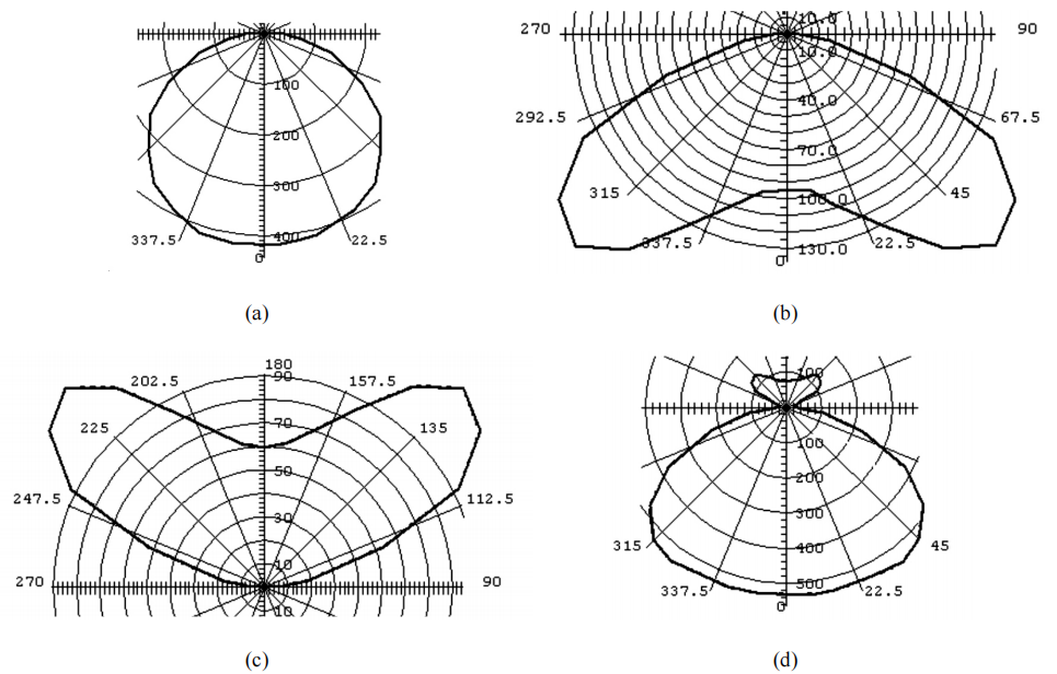 Figure 12: (a). Cosine distribution from light guide A; (b) Batwing downward distribution from light guides B; (c) Batwing upward distribution from light guides C; (d) The whole distribution when all the LEDs are switched on.