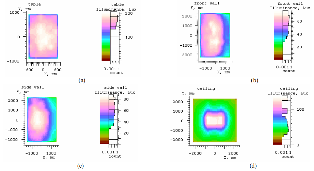 Figure 13: The illuminance distributions on the (a) table, (b) front wall, (c) side wall, and (d) ceiling.