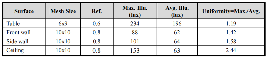 Table 4: The maximum and average illuminances on the surfaces and the uniformity ratios.