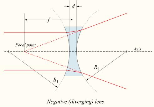 If the lens is biconcave or plano-concave, a collimated beam of light passing through the lens is diverged (spread); the lens is thus called a negative or diverging lens. The beam, after passing through the lens, appears to emanate from a particular point on the axis in front of the lens. For a thin lens in air, the distance from this point to the lens is the focal length, though it is negative with respect to the focal length of a converging lens.