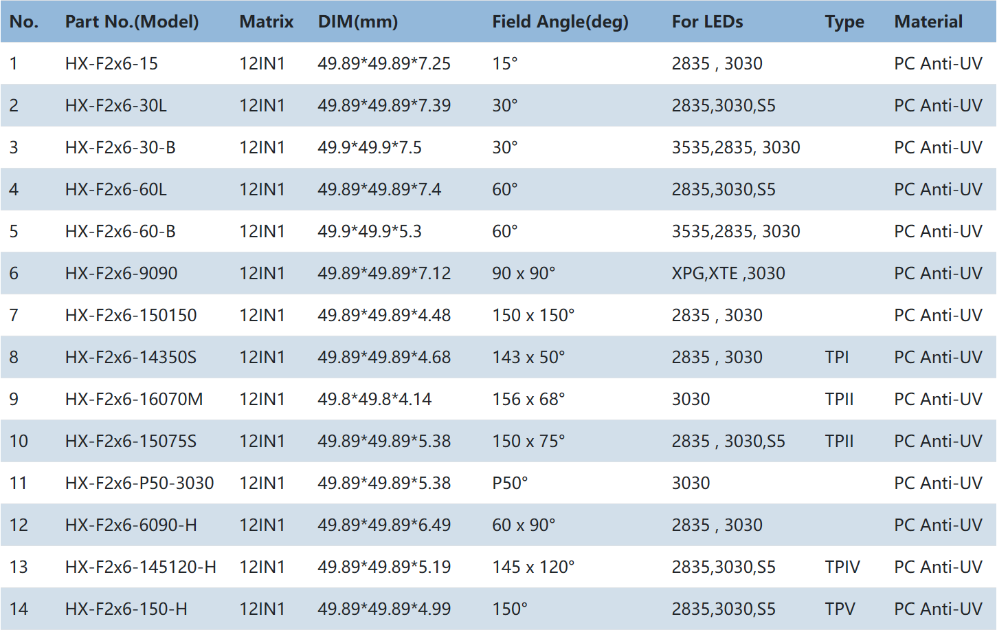 HX-F2x6-xx Series optics (50x50mm 2X6 arrays) ensure optimal lighting conditions for both players and spectators that meet the standards and requirements of different sports,for flood lights,tunnel lights,stadium lights,parking lot lighting high bay lighting.Beams are designed for symmetrical and asymmetrical low glare sports floodlights. Optimized for HP 3535 and compatible with up to 5050 size flat LED packages.
