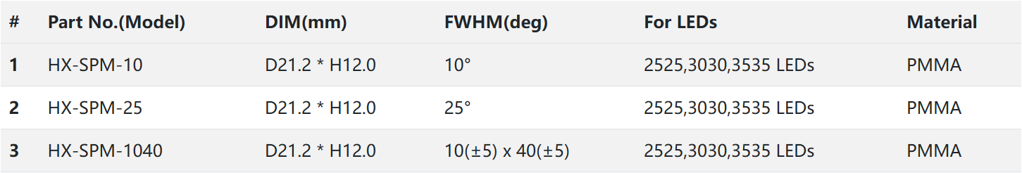 The HX-SPM Series optics LED lenses, TIR-lens with multiple beam patterns designed to be easily protected against the environment by conformal coatings. Available with or without two-sided adhesive tape.Perfectly compatible with CREE XP, XT, XHP35; OSRAM OSLON Square, P7, P8; Seoul Z5P, Z5M; Luxeon T; Federal 3535; LG 3535; Samsung 3535; Nichia 119A LEDs.Widely used in basketball court lighting, gymnasium lighting, badminton court lighting, volleyball court lighting, underwater lighting, outdoor landscape lighting (or lens), security equipment, traffic display lighting (or lens), electronic components, automotive lamp lenses, beam lamp lenses, and stage lighting.