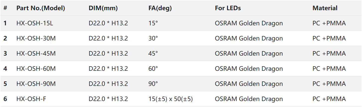 D22.0x H13.2mm with holder. The HX-OSH Series of lenses, measuring less than 22.0 mm in diameter and less than 13.2 mm tall. All subfamilies have the same dimensions and come preassembled in lightweight, durable holders with fastening tape that makes their installation fast and easy. The HX-OSH Series family has a wide selection of beams from narrow to wide flood. Perfectly compatible with OSRAM Golden Dragon LEDs. Widely used in basketball court lighting, gymnasium lighting, badminton court lighting, volleyball court lighting, underwater lighting, outdoor landscape lighting (or lens). Security and traffic display lighting (or lens).