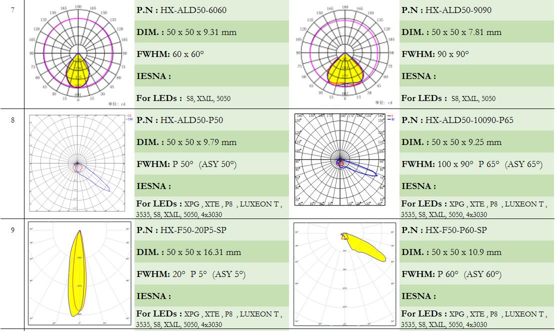 HX-F50 Series optics (50x50mm 2X2 arrays) ensure optimal lighting conditions for both players and spectators that meet the standards and requirements of different sports,for flood lights,tunnel lights,stadium lights,parking lot lighting high bay lighting.Beams are designed for symmetrical and asymmetrical low glare sports floodlights. Optimized for HP 3535 and compatible with up to 5050 size flat LED packages.