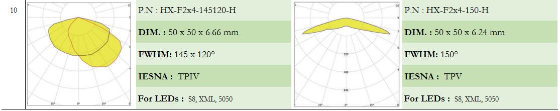 HX-F2x4-xx Series optics (50x50mm 2X4 arrays) ensure optimal lighting conditions for both players and spectators that meet the standards and requirements of different sports,for flood lights,tunnel lights,stadium lights,parking lot lighting.Beams are designed for symmetrical and asymmetrical low glare sports floodlights. Optimized for HP 3535 and compatible with up to 5050 size flat LED packages.