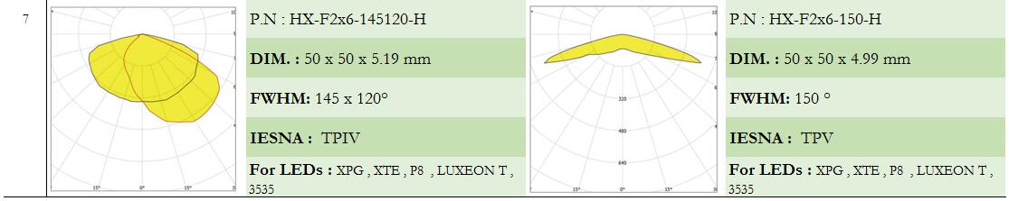 HX-F2x6-xx Series optics (50x50mm 2X6 arrays) ensure optimal lighting conditions for both players and spectators that meet the standards and requirements of different sports,for flood lights,tunnel lights,stadium lights,parking lot lighting high bay lighting.Beams are designed for symmetrical and asymmetrical low glare sports floodlights. Optimized for HP 3535 and compatible with up to 5050 size flat LED packages.