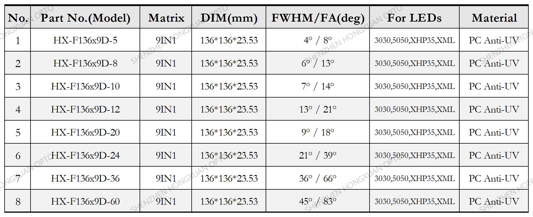 9in1 Matrix 136mm Highbay Lighting PMMA PC LED Lens for CREE XHP35, XML | OSRAM P7 Square 3535 5050 LEDs (HX-F136x9D Series)