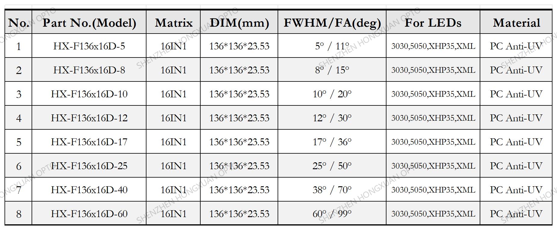 All subfamilies feature the same dimensions, excellent optical performance, and high cost-effectiveness. They offer a wide selection of beams, ranging from narrow to wide flood. Perfectly compatible with CREE XQE, XPE, XHP35, XPL; XML, Square, P7, P8; Seoul Z5P, Luxeon T; Samsung 3535; 5050, 3030, 3535 LEDs, etc. Widely used in basketball court lighting, gymnasium lighting, badminton court lighting, volleyball court lighting, underwater lighting, outdoor landscape lighting (or lens), security equipment, traffic display lighting (or lens), electronic components, automotive lamp lenses, beam lamp lenses, surgical shadowless lamps, and stage lighting.